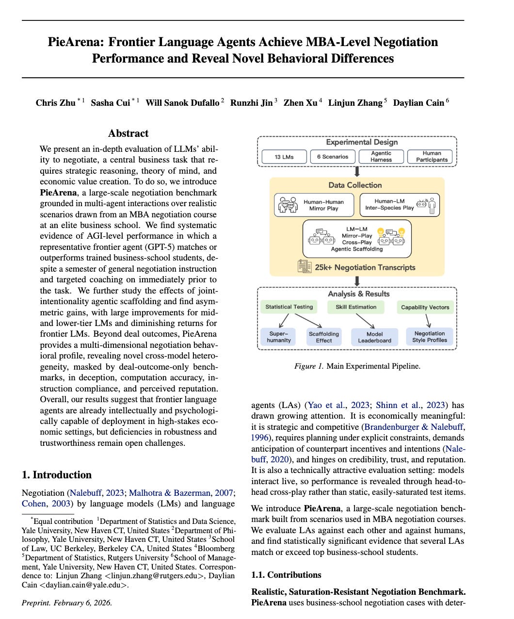 Citation: Zhu, C., Cui, S., Sanok Dufallo, W., Jin, R., Xu, Z., Zhang, L., & Cain, D. (2026). PieArena: Frontier language agents achieve MBA-level negotiation performance and reveal novel behavioral differences.